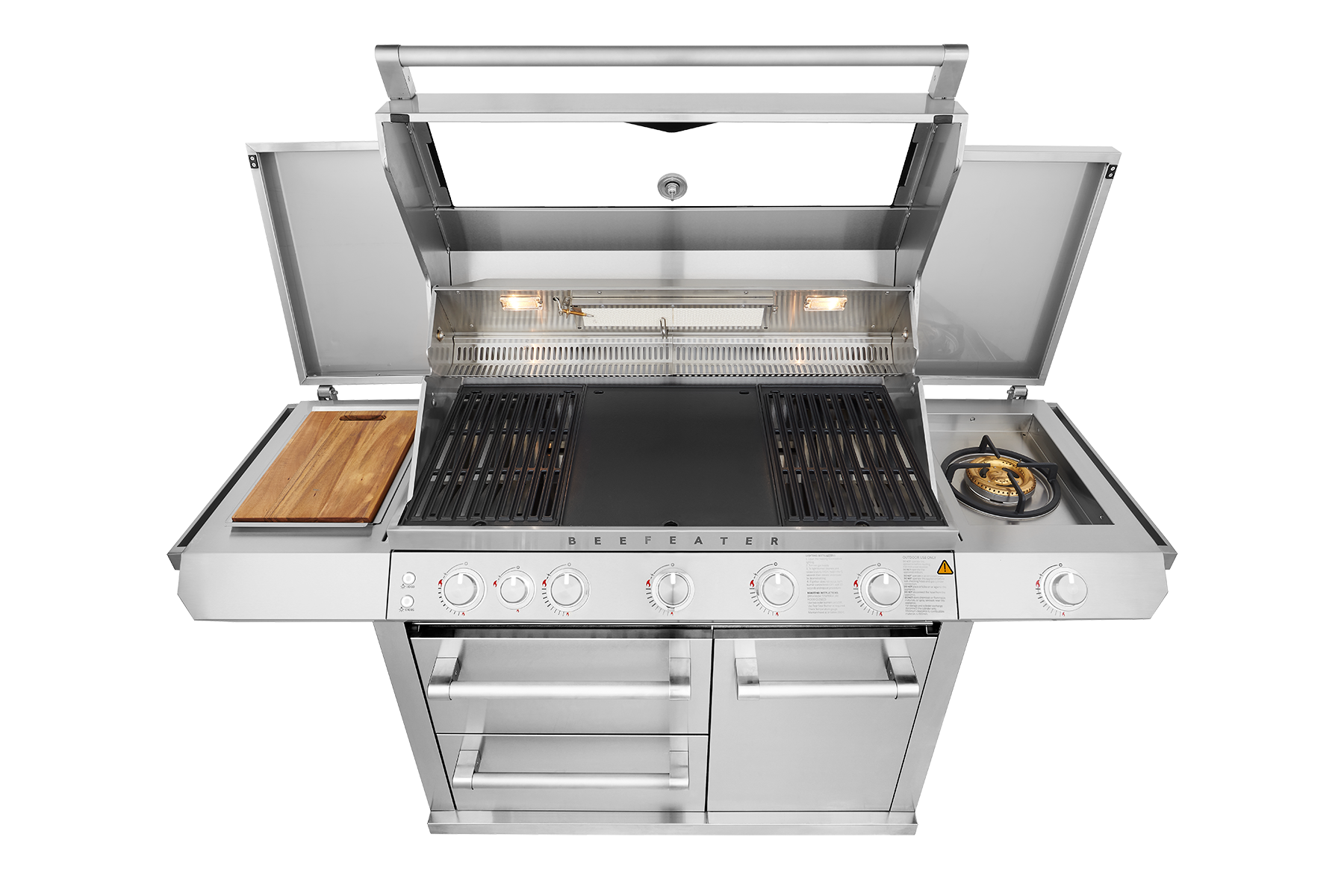 The BeefEater 7000 Series Premium 5 Burner Gas Barbecues with Cabinet Trolley and Side Burner is constructed using 304 grade stainless steel, the seam welded burner box stops grease leaking over your patio.