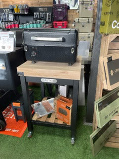 Oak top butchers block table on a black powder coated frame , the table comes on castors for easy moving and can be locked off