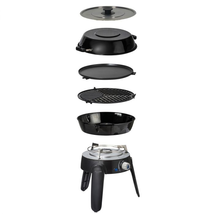 Discover the Safari Chef 30 range; widely regarded as the UK’s number one camping and caravanning necessity. The Safari Chef BBQ weighs less than 4kg, making it ideal for camping, picnicking and fishing. The LP QR unit comes complete with integrated quick release coupling for quick action (un)coupling with a self sealing valve. Offering multiple interchangeable cooking surfaces, the unit comes with a ceramic BBQ Grid, ceramic Flat Grill Plate, enamelled Dome Lid which doubles as a pot for cooking and a removable pot stand for use with your own kettle and pans. Super easy to pack away, the legs of this grill simply fold underneath and it all fits easily into the storage bag.